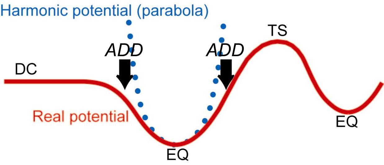 ポテンシャルの極小点EQからエネルギーの低い方向を優先すれば反応経路をたどって反応の遷移状態 TSに到達できそうに思えます。ところが、このアイデイアでは失敗に終わります。EQで基準振動解析す ると明らかになりますが、一番エネルギーの低い方向は、結合角の変化や環の変形や内部回転などで結 合の切断や組替が起きる化学反応とはまったくほど遠い方向なのです。失敗せずにポテンシャルの底か ら反応経路をたどることは、ポテンシャルの非調和下方歪ADDに着目することで可能になりました。EQの周りで求められる基準座標に沿って、いろいろな基準振動モードが存在しますが、低い振動数の モードの方向は広がった(ゆるやかな)放物線になり、高振動数のモードの方向は逆に尖った(急な)放物 線になります。非調和下方歪ADDの大きさを正しく見積もるには、方向によって放物線(調和ポテンシャ ル)の形の違いが邪魔になります。この問題は、基準座標を、振動固有値の平方根でスケールした新しい 基準座標(Scaled Normal Coordinate)に変換すれば、簡単に解決します。このようなスケーリングを導 入することで、調和ポテンシャルの値が等しい等高面は、EQからの距離が正確に等しい、すなわち、ま んまるな超球面になります。そこで、このようにしてスケールした超球面上での実際のポテンシャルを 調べると、ADDが大きいところでは、エネルギーが下がるため、スケールした超球面上にエネルギー極小 点を与えることになります。