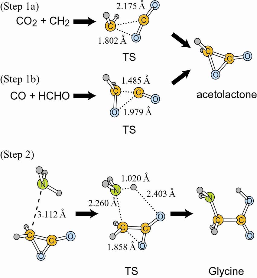 逆合成の目的物質としてグリシンH2NCH2COOHをとりあげてみましょう。まず、上の図に示したように、 目的物質のグリシンを出発点にして、その分解(解離)経路を調べます。すると、上の図に示したように、 アンモニアNH3が生じる経路、二酸化炭素CO2が生じる経路、水素H2が生じる経路、一酸化炭素COが生じ る経路などが得られます。これらの分解経路を逆にたどれば、グリシンが過不足なく合成される経路が わかります。こうした解析によって、合成反応経路を探索することができます。このような逆合成解析を、NH3と一緒に生成するアセトラクトンH2C(O)C=Oにも適用すると、さらに、 CO2とメチレンCH2に分かれたり、COとホルムアルデヒドHCHOに分かれたりする分解過程が得られます。 その結果、CO2とCH2、もしくは、COとHCHOからアセトラクトンを合成し、さらにそれにアンモニアNH3 を加えることで、グリシンが合成される反応経路(下の図のSetp 1aまたはStep 1bに続き、Step 2を経 る過程)を設計することができます。