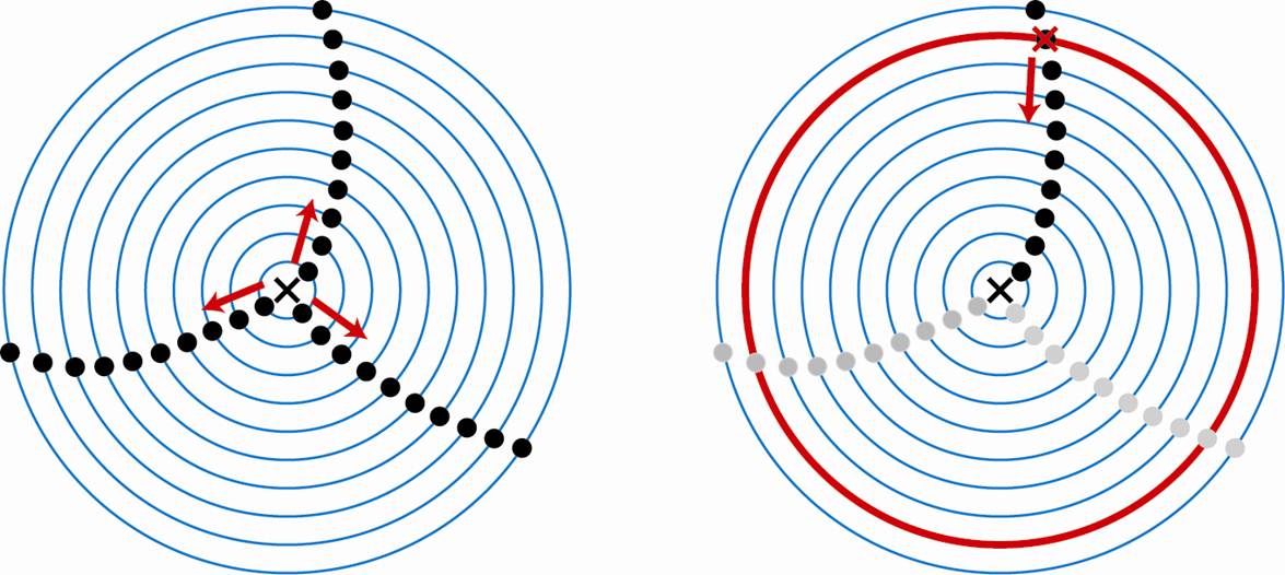SHS法では、1つの平衡構造EQを中心にした超球面を用いて、中心から外側に向かって超球面のサイ ズを拡大しながら探索を進めます(上図左)。多段階反応の途中を調べる中間体解析では、目的物質 が既に与えられているので、最初から球面のサイズをその目的物質が球の表面に位置するように設定 することができます(上図右)。そうしておいて、球面のサイズを縮めていくと、球の中心に位置す る出発物質まで素早く反応経路をトレースすることができます。これが、球面縮小法SCWとよばれる もので、球面を拡大する場合は、一般に多数の経路が出てきてその1つ1つを丹念に追いかけるので 時間がかかりますが、球面を縮小する場合は、目的物質と出発物質を結ぶ1つの経路を追跡するだけ なので、非常に簡単に中間体を探索することができます。ここで、SCWでは途中のTSを求めることを省 いていますので、その点でも球面を拡大するSHS法とは比べものにならないぐらい高速化しています。
