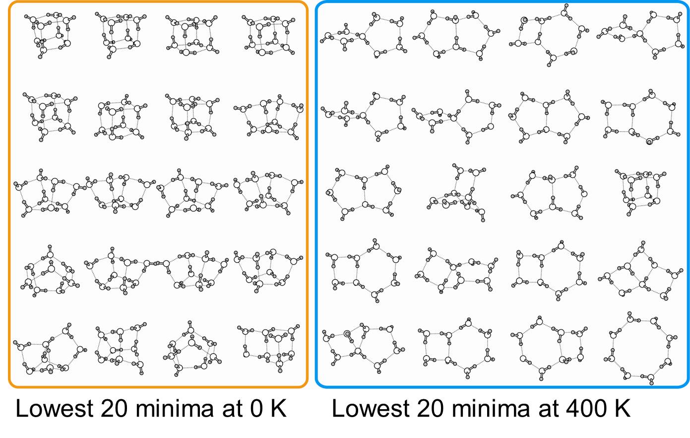 以上のことを考慮して、LADD=5、Nlowest=24、T=0 KまたはT=400 Kで、水分子8量体クラスター の探索を行った結果を、上の図に示しました。左側が0 K、右側が400 Kでの自由エネルギーの低い構 造20個を、それぞれ、左上から右下へと並べてあります。0 Kでは、Cube状の構造など立体的な形状 をもつものの安定性が高いのに対し、400 Kでは、複数の環状構造が連結した構造の安定性が高くなっ ていることがわかります。この例からわかるように、GRRMプログラムを利用すると、種々の構造が多 数存在するるクラスター構造の安定性が、温度によってどのように変わるかを調べることができます。