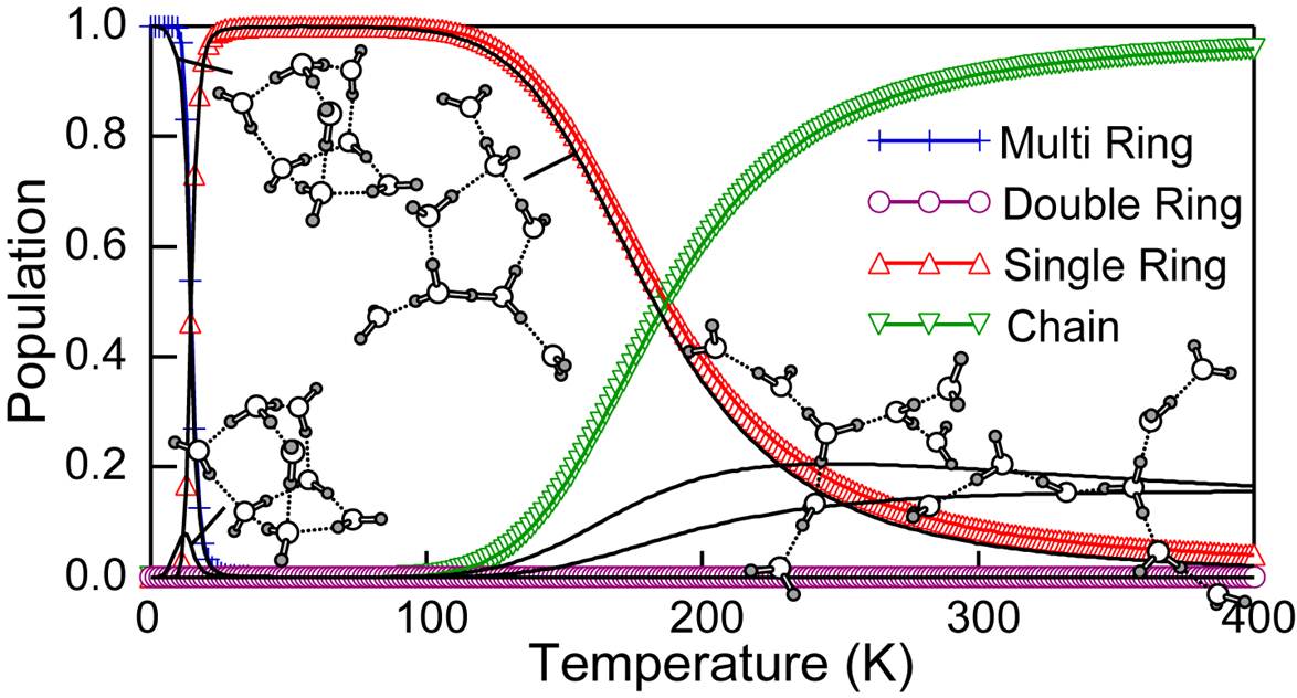 下の図は、>H+(H2O)8クラスターについて、LADDとNlowestの 指定を行い、いろいろな温度を指定して、熱分布を調べた結果をまとめたものです。GRRMプログラム の出力結果のデータを使うと、各温度での分配関数を求めることができますので、各構造の熱分布を を算出することが可能です。プロトン1個を含む水分子8量体クラスターでは、温度が低いときは、 水素結合で結ばれた環状構造が支配的であるのに対し、温度が高くなると環状構造を含まない鎖状構 造が支配的になることがわかります。この結果は、最先端の実験手法で行われたクラスターの分光実 験の結果をよく説明しています。