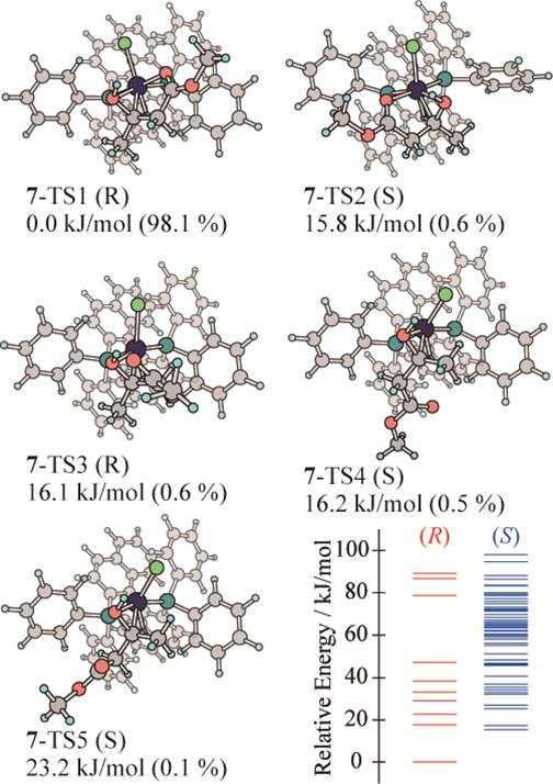 上図の右に、Ru-BINAP触媒を用いた反応過程のTSのうち自由エネルギー(室温)の低いも のを系統的に探索し、そうしてみつかったTSのうちのエネルギーの低い方から5番目までを 示してあります。右下には、室温での自由エネルギーが100 kJ/molの範囲内のTSをR体とS体 にわけて、エネルギー分布を示してあります。この結果から、室温で一番自由エネルギーの 低いTSはR体であり、その次に低いS体のTSとは約20 kJ/molもの大きなエネルギー差があるこ とが判明しました。このことから、このRu-BINAP触媒が、R体の反応生成物を選択的に導く 不斉触媒として、非常に高い不斉選択性を示すことが、解明されました。