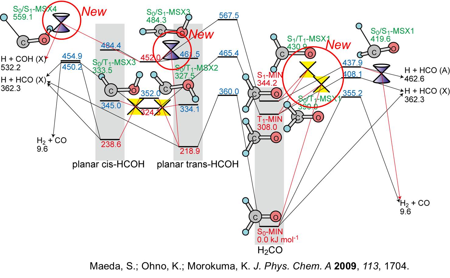 GRRM11プログラムを用いた結果、最低一重項励起状態(S1)および最低三重項励起状態(T1) の近くに、2つのMSX(ポテンシャル交差極小点)があることが見つかりました。これらの MSXは、既に提案されていたMSXよりもはるかに重要性が高く、これらのMSXがホルムアルデ ヒドの光化学反応のメカニズムを決めていることが発見されました。このほか、異性体であ るcis-およびtrans-ヒロドキシメチレンH-C-O-Hが関係する2つの新しいCI(円錐交差点)が みつかりました。