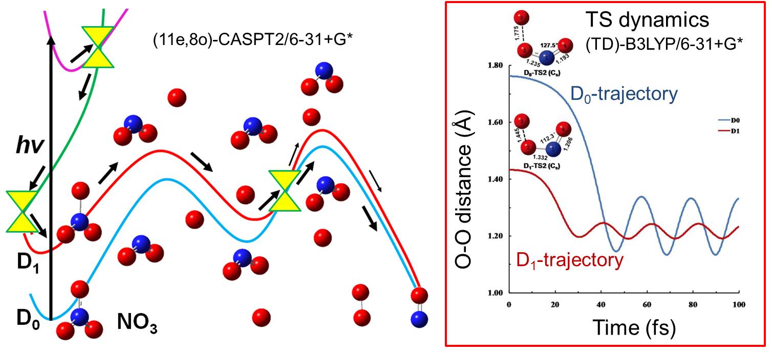 GRRMプログラムによる光化学解析によって、これまで知られていなかった反応機構がいろ いろ明らかにされています。下の図は、NO3の光解離解析に応用した結果です。解離して生じるO2の振動励起が 活発に起きるhot過程に加え、振動励起があまり激しくないcold過程も付随することがわかり ました。このcold過程は、励起状態D