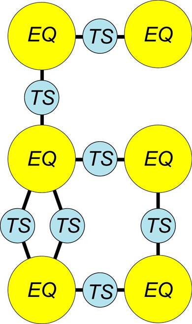 これは、反応経路網の全面探索を行うGRRMの基本アルゴリズムです。そのフローチャートを下の左側 に示しました。下の右側の図は、どれか1つのEQから出発して、EQ-TS-EQの連鎖をたどって得られる反 応経路の全体像の模式図です。GRRMプログラムは、このような反応経路網の全貌を自動的に探索することを 初めて可能にしました。