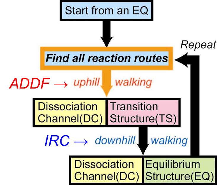 (1)得られたEQから、ADDfで反応経路に沿って登坂し、その周囲の全ての反応経路を見つけます。