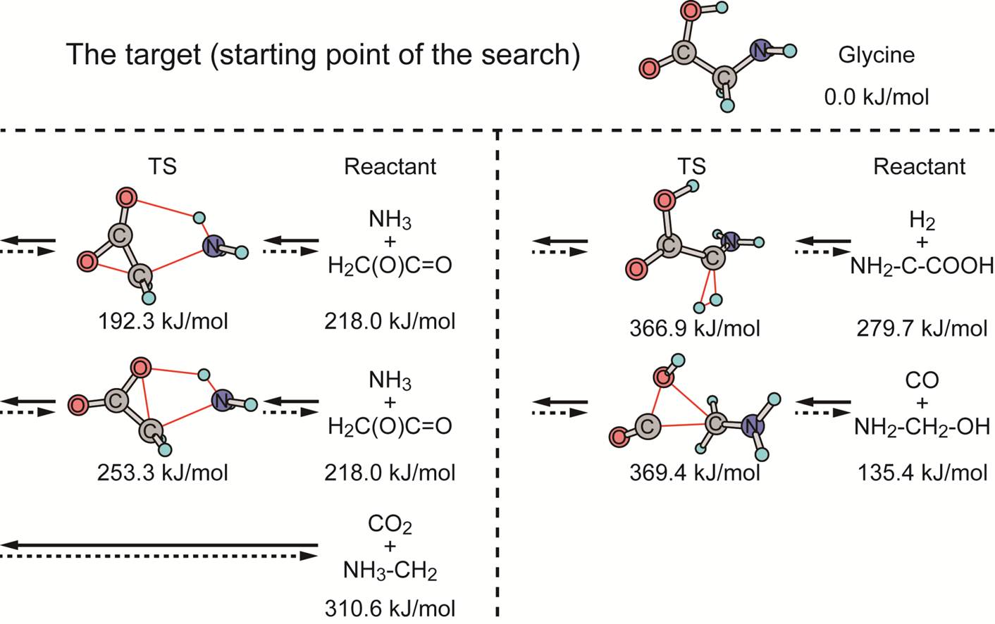 逆合成の目的物質としてグリシンH2NCH2COOHをとりあげてみましょう。まず、上の図に示したように、 目的物質のグリシンを出発点にして、その分解(解離)経路を調べます。すると、上の図に示したように、 アンモニアNH3が生じる経路、二酸化炭素CO2が生じる経路、水素H2が生じる経路、一酸化炭素COが生じ る経路などが得られます。これらの分解経路を逆にたどれば、グリシンが過不足なく合成される経路が わかります。こうした解析によって、合成反応経路を探索することができます。このような逆合成解析を、NH3と一緒に生成するアセトラクトンH2C(O)C=Oにも適用すると、さらに、 CO2とメチレンCH2に分かれたり、COとホルムアルデヒドHCHOに分かれたりする分解過程が得られます。 その結果、CO2とCH2、もしくは、COとHCHOからアセトラクトンを合成し、さらにそれにアンモニアNH3 を加えることで、グリシンが合成される反応経路(下の図のSetp 1aまたはStep 1bに続き、Step 2を経 る過程)を設計することができます。
