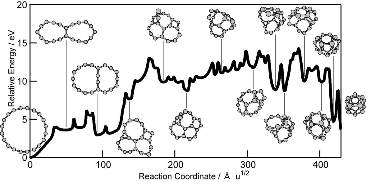 中間体解析の例として、非常に大きく構造の異なる円環状C20とかご状C20の間の中間体を調べた例を とりあげてみましょう。円環状のC20は、等間隔のCC結合が次々に連なった形をしています。これに対し て、かご状(フラーレン型)のC20は、五角形でとり囲まれた立体的な形をしています。大幅に結合の 組み替えを行わないとこの2つの構造が結ばれないことは明らかです。このような大きく構造の異な るもの同士の中間体を調べることは、他の方法では全く不可能でしたが、GRRMプログラムに搭載された SCW法を用いると簡単に調べることができ、下の図のように、35個のTSを経る非常に長い多段階反応経 路がみつかりました。下の図では、中間体の一部しか構造を図示していませんが、中間体35個全部の構 造およびそれらを結ぶ35個のTSの構造、さらにそれを結ぶ反応経路に沿って20個の炭素原子が立体的に どのように移動して反応が進むかが明らかにされました。このように、GRRMプログラム搭載のSCW法、2PSHS法を用いると、出発物質と目的物質の構造がかなり 違っていても、それらを結ぶ反応経路や中間体を調べることができます。