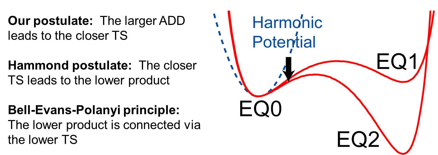 Theoretical grounds of LADDf can easily be understood from the figure shown above. When potetial energy curves connecting the reactant EQ0 with the product EQ1 or EQ2 are compared, usually the lower product is linked with the closer or the lower TS. Such tendencies are familiar to chemists as Hammond postulate and Bell-Evans-Polanyi principle. It follows that in our ADD concept the larger ADD may lead to the closer (the lower) TS, which is possibly linked with the lower product. In the LADD option of GRRM, one may limit the number of the larger ADD path ways as LADD=n, where the n-th largest ADD are followed in the exploration. This limited search by LADD considerably shorten the time for exploration.