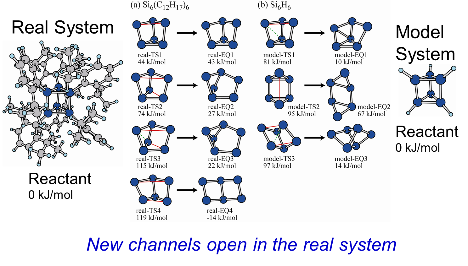 上図の右にケイ素原子6個が三角柱型に配列された構造に6個の水素原子が結合したモデ ルシステムが示されています。この場合のケイ素を炭素で置き換えたものは、プリズマンと よばれるベンゼンの異性体です。プリズマン型のSi6H6の6個のHを、嵩だかいアルキル基 C12H17で置き換えたものが上図(b)の左の図で、このよう巨大な反応場に対しても、GRRMプロ グラムによって、反応経路探索を行うことができるようになりました。