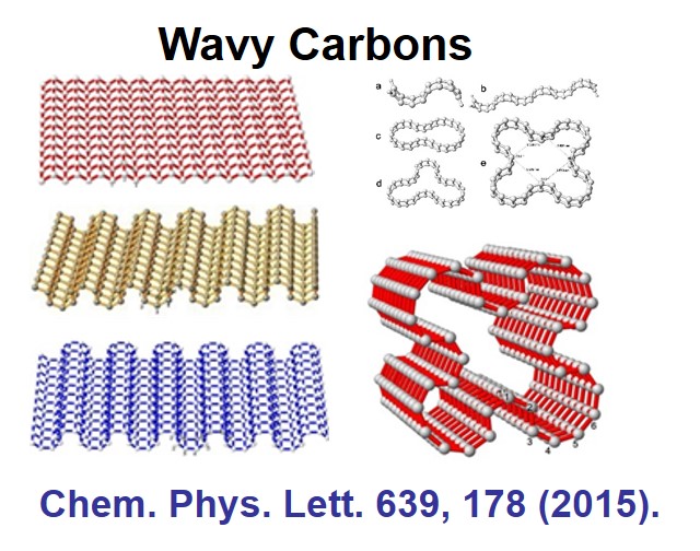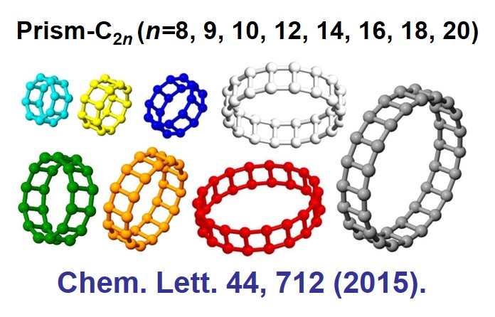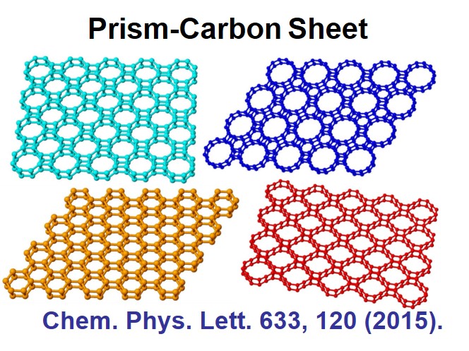 多角柱型のPrism-C2n、Prism-Carbon Sheet、Prism-Carbon Tube、Wavy Carbonが、新型炭素として発見されました。これらの新型炭素は、6角形や5角形を